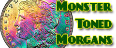 View the largest and ever expanding gallery of high-end and Monster rainbow toned Morgan dollars, an informational guide on how to tell natural vs. artificial toning, learn to price toned Morgans, view auction results of rainbow Morgans, and view what characteristics to look for in high-end toned rainbow Morgan dollars.