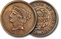 94.90 grains. The design is similar to that on production large cents except there are no stars on the obverse, and the diameter is smaller. Struck in copper with a plain edge. The chocolate-brown surfaces show only slight reflectivity in the fields. The ... |