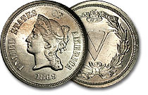 Scarce 1868 5c NGC PF64 Pattern V Nickel - Judd 633, Rarity-4 Beautiful example of this gorgeous pattern piece. Similar to the three cent nickel, Liberty wears a coronet that bears a star and is inscribed "LIBERTY" on the obverse. A large Roman numeral `V... |