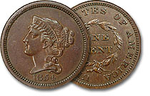 Rare 1854 1c NGC PF62BN Pattern Coronet Cent - Judd-160, Pollock-187; Rarity-4. Struck in copper; plain edge. The design is similar to that of regular-issue 1854 Coronet Cents, except there are no stars on the obverse, and the diameter is little smaller. ... |