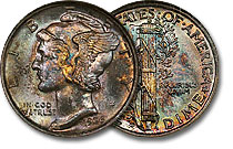 Awesome 1936-S 10c NGC MS67FB Toned Mercury Dime. Mottled rainbow tones are vibrant and splashed across obverse and reverse. Full bands are sharp as are the overall design elements on this keenly struck example. Flashy luster enhances the overall look. ... |