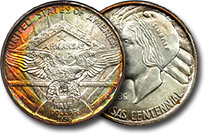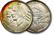 Attractive teal blue and lime green mingle with pumpkin orange and varying shades of yellow and chartreuse throughout the obverse of this stunning Early Commemorative. CAC beanered. ... |