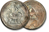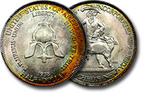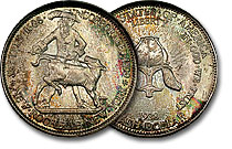 This fabulously toned New Rochelle Commemorative is intensely lustrous and boasts a stunning banded rainbow flowing across the reverse. (We all know the reverse is prettier than the obverse of this commemorative anyways)... |