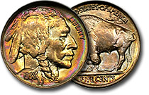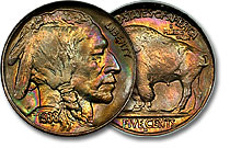Enticingly lustrous surfaces are ringed with a full band of rainbow colors encircling the obverse of this stunningly beautiful buffalo nickel. Although a common date, fabulously attractive buffalo nickels are always hard to find and keeping a steady suppl... |