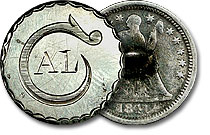 Lovely 1849 NGC MS62 Territorial Moffat Gold Five Dollars is well preserved with frosty golden and highly lustrous fields and fully struck devices. Moffat & Co. was considered the most important private coiners in California. Interestingly on the coronet ... |