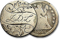 This early Seated Quarter (1848) love token features the initials “L.D.L” on a scroll and accompanied by ornamental floral engravings. You can procure this love token to keep as a constant reminder to watch your cholesterol. ... |