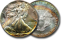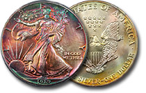 | 1989 $1 PCGS MS67 Rainbow Toned Silver American Eagle |