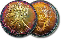 | 1997 $1 PCGS MS68 Monster Rainbow Toned Silver Eagle |