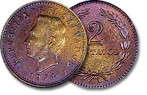 This visually appealing El Salvador 2c is enveloped in a pleasing magenta/purple/blue coloration. This coin was graded MS64 by NGC with certification number 3161417-013. ... |