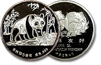Issued by the People''s Bank of China to commemorate the 96th ANA Coin Show in Atlanta, GA. The obverse design is a panda in a bamboo grove, inscribed with silver content and fineness .999. The reverse design is the flags of People''s Republic of China an... |