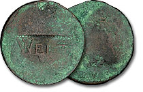 This quite heavily weathered Draped Bust Large Cent is counterstamped with “WELT” on the obverse and something I can’t quite discern on the reverse beginning in “P”. ... |