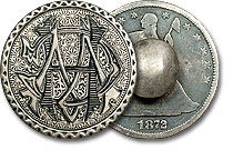 This intricately designed Trade dollar love token still has the pinback hardware fully attached and features a gothic ‘JAA’ on the moneyside set on an open field and surrounded by a clover border.