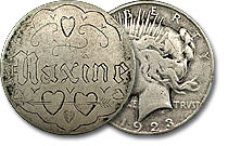 This is the quintessential love token. This beautiful Peace Silver dollar features the name “Maxine” accompanied with hearts, cupids arrows and whimsical ornamental engravings. ... |