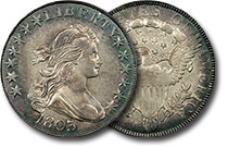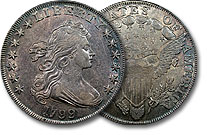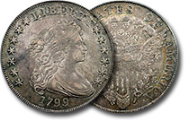 This stunning 1799 Draped Bust Dollar is choice in every way! 7x6 obverse stars. Keenly struck motifs are surrounded by well preserved surfaces. PQ and lustrous, this desirable lady will please the fussiest of collectors. ... |