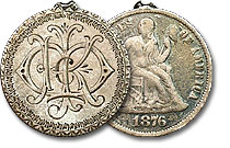 This lovely Seated Half Dollar love token raises more questions about it’s past than many others I’ve cataloged. The initials “HFM” are accompanied with the phrase “VERY UNPLEASENT” beneath the initials. ... |