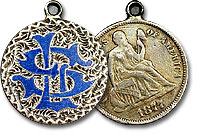 This fantastic love token on a Seated dime is beautifully adorned with blue enameling on the initials ‘LS’. The initials are set on a stunningly intricate field.