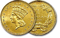 This bright and flashy gold dollar exhibits very high AU details and shows very little evidence, only a smooth part of the edge at the top, of a loop that was long since removed. There is also a slight bend in the coin that is worth mentioning. Additional... |