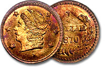 Beautiful 1870 Territorial Gold Fractional BG-808 exhibits satiny smooth orange peel fields with lovely plum hues at rim. Fields are well preserved and problem free. Devices well struck with terrific eye appeal throughout. Scarce in such a lofty state.... |