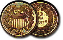 This massively beautiful Gem Red-Brown Two Cent piece exhibits stunning shades of lime, coppery red, magenta, and teal-blue on the deeply mirrored fields of the obverse and reverse. This was a VERY difficult coin to image so if anything, it looks much bet... |