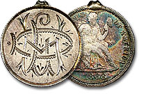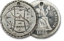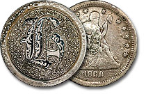 This original Seated Dime love token is nicely engraved with the initials “SHC” on the moneyside and accompanied by an attractive, light border. ... |