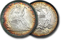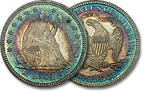 Unbelievably beautiful gorgeously toned 1874 Proof Liberty Seated Half. This coin is the definition of the word WOW!! Devices are frosty and superbly struck. Fields are ablaze in orange and gold tones extinguished at the rims in an icy blue and sea green ... |