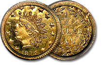 Gorgeous 1874 Half Dollar Round Territorial Gold Fractional, Small Indian Head with value and CAL in wreath- BG-1052. Flashy and superbly struck this piece will please the fussiest of us. Device is frosty and well struck, fields are glassy and lustrous. W... |