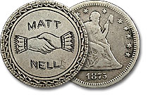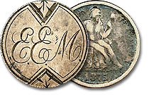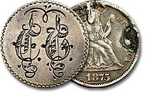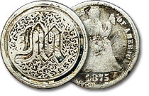 This 1875 Seated Dime is beautifully engraved with the initials “E.E.M.” which is also accompanied by a bold border pattern and accompanying engravings. ... |
