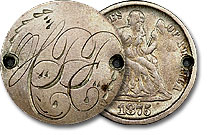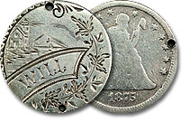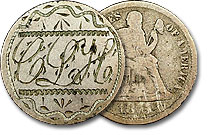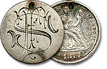 This fabulous Seated Dime love token is elegantly engraved with the initials “HJE” in a whimsical fashion and accompanied with ornamental engravings. ... |