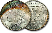 This exquisitely toned Carson City Morgan Dollar exhibits a beautiful mossy green, icy blue, and burnt orange highlighted with a hint of magenta crescent on the obverse of this very frosty and lustrous Morgan Dollar. ... |