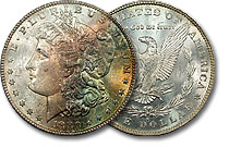 This is one striking Morgan dollar. The fascinating rainbow hues banded across the obverse glow on the reflective fields and create a resplendent presence on Liberty''s face. Shades of deep plum in the left obverse field blend into emerald green, magenta,... |