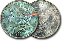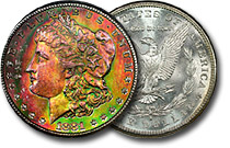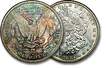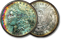 The reverse of this intensely lustrous Morgan dollar exhibits blue, pink, and gold toning across the entire reverse. The surfaces exhibit a desirable bowl luster. ... |