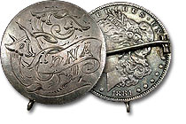 This powerfully engraved Morgan dollar love token still has the pinback hardware attached. The name ‘Bessie’ is engraved and surrounded by beautiful ornamental engravings and accompanied by an ornate bird. The whole design is surrounded by a light wavy bo... |