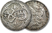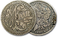 This ornately engraved Morgan dollar love token features ‘Minnie’ on the moneyside and is set on an intricate field and surrounded by an attractive medium border.