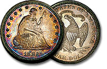 Mindblowing toning graces this beautiful 1882 Proof Seated Quarter. Frosted and well struck devices are dancing in fiery fields of orange extinguished at rims by a chilling icy blue with subtle pastel overtones. Color amazes and delights throughout. Bette... |