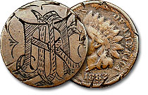 This 1882 Indian Cent love token is quite weathered but very attractive. The initials “JAK” are engraved on a smooth field and accompanied by ornamental engravings. ... |