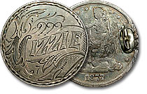 I really had a hard time discerning the initials on this whimsically engraved and visually stunning Seated half love token. The pinback hardware is only missing the pin.