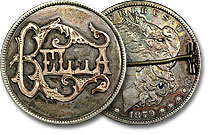 This ornately engraved Morgan dollar love token features ‘Minnie’ on the moneyside and is set on an intricate field and surrounded by an attractive medium border.