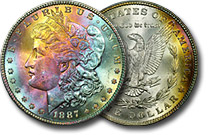 | 1887 $1 PCGS MS65 CAC Lustrous Rainbow Toned Morgan |