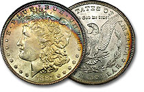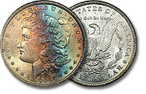 This attractively toned Morgan dollar features a lovely rainbow of orange, icy blue, lime, reddish gold, green, and plum near the obverse upper rim. The rest of the obverse is a light golden hue. The surfaces are very lustrous. ... |
