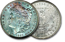 | 1887 $1 PCGS MS65 CAC Neon End-Roll Toned Morgan |
