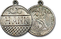 This boldly engraved 1887 Seated Dime Love Token features HANK on the moneyside accompanied by ornamental engravings. There is also a loop affixed for use on a bracelet or necklace. ... |