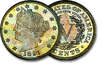 | 1891 5c PCGS PR65 Lime-Ice Rainbow Toned Proof Lib-Nick |