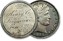| 1892 25c US Barber Quarter Love Token – J. Harriman Dot No 5 |
