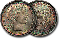 Stormy shades of teal, emerald green, gold, magenta tinted with purple flow all across the obverse and reverse of this outstanding near gem Barber Quarter. The coin has excellent luster and looks by far nicer than the assigned grade implies. ... |