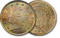 | 1908 5c PCGS MS62 Stunningly Toned Liberty Head Nickel |