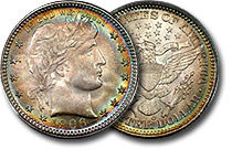 The obverse of this stunning Barber Quarter is ringed with vibrant shades of perfect rainbow hues. The centers are very frosty and the coin has excellent luster. Eye appeal this fantastic is so elusive in Barber Quarters. If you collect this series, you k... |
