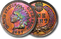 This lovely Indian cent features reddish copper fields with Liberty decked out in punk-rocker neon green, blue, and purple. Similar colors grace the design details on the reverse. This is a lovely coin that is brighter in-hand than the pictures indicate. ... |