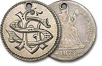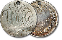 1859 U.S. Seated Dime Love Token Engraved - GMC. Maybe you are an employee of the General Motors Corporation or, more possibly, named Gertrude Maryweather Collins, this piece might be of some interest to you. It is holed for a necklace. ... |