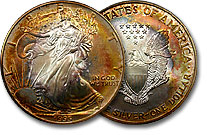 Exquisitely toned in a beautiful target pattern on the obverse composed of reddish-gold, orange, teal, lavender and icy blue. The reverse is toned in a deep mottled, yet colorful, pattern that does not obstruct the lustrous surfaces beneath the shimmers o... |