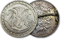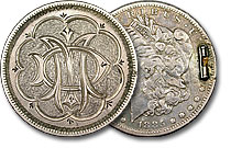 This fantastic Love Token Morgan Dollar is exquisitely engraved with the initials LM and features working pinback hardware and some attractive natural rainbow toning on the pinback side. ... |